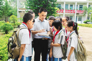| 谢浩(中)课后和学生们在一起。 本报记者 郭景水 通讯员 符发智 摄 |