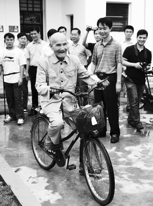 | 让老人快乐是每一个人的责任。图为9月6日,在澄迈县白莲敬老院里,97岁高龄的李以法精神抖擞,轻快骑车,引来众人围观。 海报集团全媒体中心记者 张茂 摄