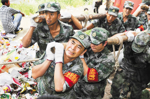 修电路 为保障彝良地震灾区洛泽河镇3000余户居民尽快用上电,部队官兵在将电杆搬运上山。 新华社发