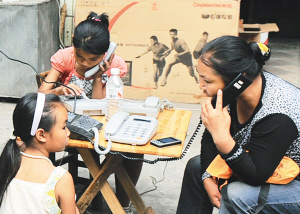 通话了 灾区群众在洛泽河镇街头给远方的亲友打电话报平安。新华社发