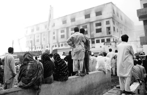 9月12日,在巴基斯坦卡拉奇发生火灾的服装厂,当地人在现场围观。 据巴基斯坦媒体12日报道,巴基斯坦两座工厂11日发生的火灾已造成至少315人死亡,另有至少275人受伤。 新华社/法新