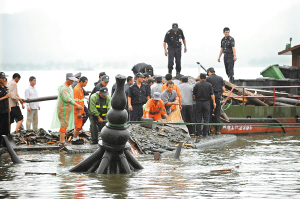 | 西湖景区工作人员在清理倒塌的集贤亭。 |
