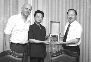 | 九月七日,吴昌茂率团访问海师大。图为该校校长韩长日向吴昌茂(中)赠送礼品。 |