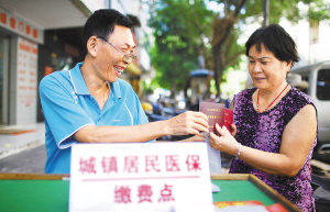 | 民生工程让海南百姓享受看得见摸得着的幸福生活。图为海口社区工作人员为居民办理城镇居民医保手续。