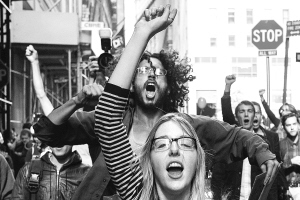 在美国纽约,“占领华尔街”运动支持者高喊口号。