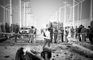 | 9月18日,在阿富汗首都喀布尔,阿富汗军官在自杀式汽车爆炸袭击现场调查。 新华社发 |