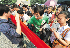 | 南京,参观者在“勿忘国耻”横幅上签名。 |