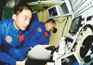 | 蛟龙第48次下潜,潜航员付文韬(左)在6900多米的深海中作业(6月22日摄)。 新华社发 |