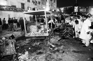 | 18日,在巴基斯坦南部港口城市卡拉奇一个繁华市场,人们在爆炸现场查看。