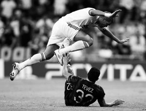 19日,在欧冠联赛小组赛中,皇马主场以3:2战胜曼城队。图为皇马球员佩佩(上)与曼城队特维斯在比赛中拼抢。 新华社发