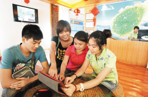 9月21日上午,在三亚步行街旁边的新式旅游体验店里,某旅行社的旅行顾问张彦婷(右一)用手中的iPad向年轻游客逐一介绍海南各大景点景区的独特魅力。 在根据海南民居特色设计的旅游体验店里,游客可以通过iPad及电视等多媒体,提前了解并通过相应的仿真设施体验旅游产品,再选择旅游目的地,实现对旅游产品的“透明化”了解。 本报记者 张杰 摄