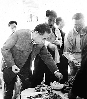 | 1960年周恩来考察海南热带植物园时,品尝木薯糕点。(资料图片) |