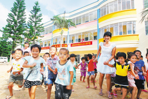 | 9月10日,邦溪镇中心幼儿园大班的孩子和老师,在刚投入使用的教学楼前做游戏。 本报记者 苏晓杰 摄 |