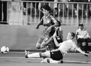 | 中国队球员张晨(上)带球进攻时遭遇德国球员阻截。