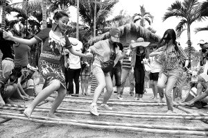 | 27日,万宁槟榔基地里,参加“绿色崛起看海南———2012年全国重点网络媒体海南行”的网络媒体编辑记者与黎族阿妹跳起了竹竿舞。海报集团全媒体中心记者 秦彦 摄 |