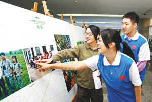 10月10日,北京林业大学,海南鹦哥岭青年团队先进事迹报告团成员之一周薇(左一),报告会后被同学们拉到图片展板前讲解鹦哥岭青年团队的事迹。 本栏照片由本报特派记者 李英挺 摄