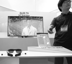 三星发布世界首款 “双视图”电视机 可以让两人在戴上3D眼镜后,同时观看不同的节目 10月11日,在韩国高阳市举办的“国际信息显示设备展览会”上,工作人员展示世界首款“双视图”电视机。“双视图”电视机可以让两人在戴上3D眼镜后,同时观看不同的节目。 新华社记者 姚琪琳 摄