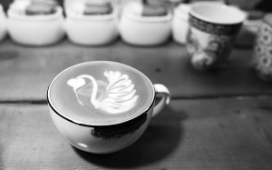 “啡常”现场即兴演示咖啡拉花:先萃取一杯Espresso(意式浓缩咖啡),然后将全脂牛奶搅拌起泡,撇掉表面较粗的泡沫,倒进咖啡里,轻轻摇晃杯子,使两种液体充分融合,变成浓稠的深棕色液体,表面布满细密的泡沫。待到杯子半满时,从靠近杯柄处往杯心倒入奶泡,手腕左右晃动,白色的奶泡在杯中划出一道优美的弧线,收梢处一顿、再一提拉,一只天鹅就浮现在咖啡表面。