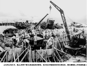 | 1979年的2月至7月,海南军区某师两个营,曾分3批进驻西沙群岛,执行建设西沙的光荣任务。图为珊瑚岛上军民紧张施工。 |