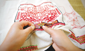 | ↑ 10月10日,一位黎族妇女在白沙黎族自治县黎锦技艺传习馆学习黎锦双面绣织法。 |