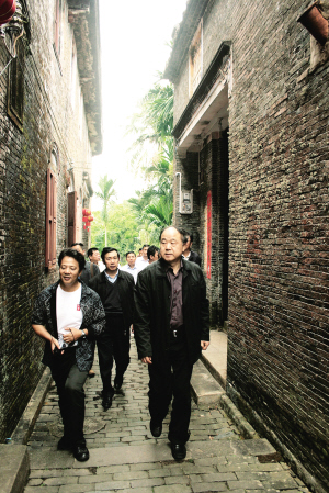| 莫言(右)一行参观琼海蔡宅。关向东 摄 |