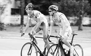 10月18日,参加2012年环海南岛国际公路自行车赛的多支车队选手已经抵达三亚,有些车手来到三亚湾进行适应训练。 本报记者 苏建强 摄