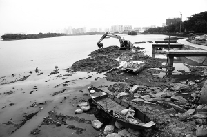 10月18日,琼海万泉河游览区,一部挖土机正在裸露的河道上作业,旁边是一只搁浅的小船。 因来水量不足,近日,万泉河下游水位大幅下降,嘉积水电站12台机组只有两台在运转。琼海市气象局提供的资料表明:今年下半年以来琼海降雨量比历年同期逐月下降30%—50%。 10月15日,万泉河上游的牛路水电站正常水位仅83.46米,比正常水位下降了21.54米。据介绍,为应对水电缺水,海南电网优化调度安排,让主要水电站停发保水多发气电。 特约记者 蒙钟德 摄