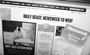美国《新闻周刊》18日宣布,将在2013年实现杂志内容的全面数字化,放弃印刷版。2012年12月31日一期的杂志将是《新闻周刊》出版的最后一期印刷版。 这张拍摄于2010年11月12日的照片显示的是,新闻网站“The Daily Beast”和一份当期的《新闻周刊》杂志。新华社/法新