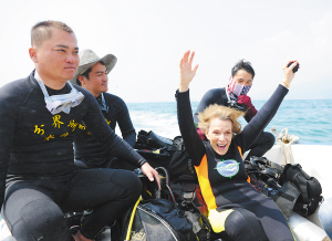 今天上午,爱好摄影的西尔维亚·厄尔博士到达分界洲岛旅游区后,就拿起她的小相机不停地拍摄。她说,这里的海很美。在海上浮排上,西尔维亚·厄尔博士戴着约25公斤重的潜水器具,踏着蛙鞋,轻松跃入海水中并很快潜入大海。