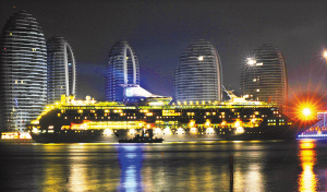 | 10月19日晚,“海洋神话号”邮轮正准备从三亚凤凰岛国际邮轮港解缆启航,开赴越南。 本报记者 苏建强 摄 |
