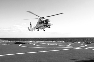 | 运送“伤员”的海监直升机降落在“和平方舟”医院船上。 |