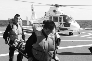 海监直升机飞抵事发空域,将2名“伤员”送至医疗船;海军搜救直升机在事发海域上空搜索落水人员,发现目标后迅速建立救护航线实施救捞,很快运送至医院船进行救护。