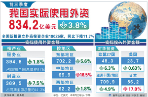 商务部19日发布的数据显示,今年前三季度,全国实际使用外资金额834.2亿美元,同比下降3.8%,与去年同期16.6%的增幅形成鲜明对比。分析认为,受全球跨国投资放缓等因素影响,我国引资金额出现同比下降,但长期来看,仍将保持相当规模。