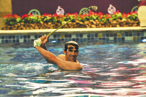美国“飞鱼”菲尔普斯在观澜湖泳池内挥杆。