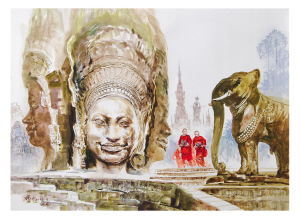 | 雷振中所画的水彩画《吴哥印象》,赠送给西哈努克。 (照片由雷振中提供) |