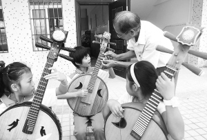 | 图为老师认真地给孩子们传授八音演奏技艺。 本报记者 李英挺 摄 |