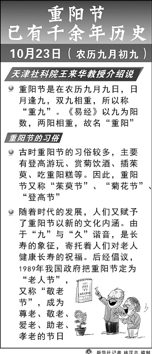 据相关资料记载,从周代开始,我国就提倡尊老、爱老、敬老,并在国都南郊高旷的地方建有老人庙。每逢中秋黎明前,皇帝要带领文武百官到老人庙祭祀“老人星”,并在夜空中寻找和观看“老人星”,以求得到祝福和庇佑。唐代以后,祭祀“老人星”的活动改在重阳日举行,并逐渐演变为民间传统节日。