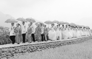 | 10月21日,在广西武宣县东乡镇下莲塘古庄园村,金婚、银婚老人和新人们一起共走“爱情路”。 新华社发