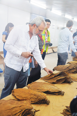 | 10月25日,来自美国的雪茄专家克林在查看儋州雪茄烟叶。况昌勋 摄 |