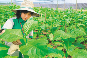 | 海南建恒哈瓦那雪茄有限公司技术员正在为烟叶植株抹芽。苏晓杰 摄 |