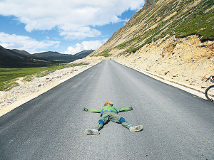 | 骑累了,在无人的公路上躺一下。 |