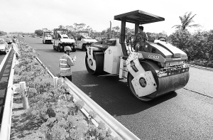 标准化施工 保证公路质量 为进一步加强对路面施工质量的动态控制,海屯高速公路的路面施工实行工程施工标准化和管理手段信息化,从加强对原材料、级配、混合料的生产、改性沥青的制作全过程、沥青摊铺速度温度的动态质量监控着手,大幅提升对沥青路面施工质量的控制水平。图为10月26日,在海屯高速公路上,工人们正在进行路面摊铺环节的施工。 本报记者 张杰 摄
