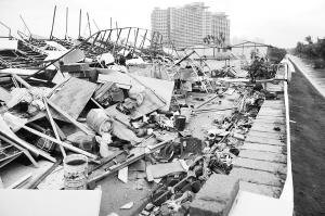 | 10月28日,博鳌一建筑工地遭台风刮倒的工棚。 特约记者 蒙钟德 摄