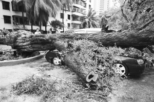 | 10月28日,三亚街头一株百年酸豆树被刮倒后压坏小轿车。 特约记者 孙清 摄 |