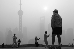 10月28日,在上海外滩,市民在雾霾中晨练。 据上海市环境监测中心发布的数据,受区域雾霾影响,当日7时,上海市中心区的国控点中,PM2.5浓度值最高是327.3微克/立方米(青浦淀山湖),最低为258微克/立方米(浦东监测站),达到中度污染。 新华社发