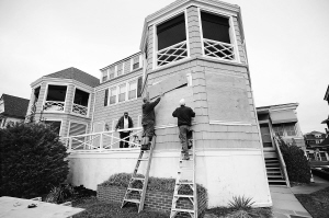 | 27日,在美国新泽西州开普梅县,几名男子给旅馆钉上木板,以避免飓风“桑迪”可能带来的危害,东部沿岸多州已相继进入紧急状态。 新华社/法新 |