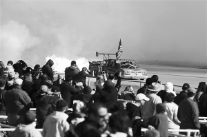10月27日,在美国得克萨斯州休斯敦的阿灵顿空军基地举行的航空展上,人们观看空军国民警卫队闪火喷气车。 美国空军最新的F-22“猛禽”战斗机和美国海军陆战队MV-22“鱼鹰”飞机以及空军国民警卫队闪火喷气车的加盟,成为此次航空展的亮点。 新华社发(贾忠摄)