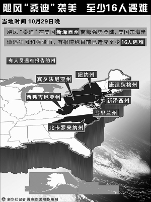 美国国家飓风研究中心信息显示,“桑迪”于北京时间30日8时左右“正面”冲击大西洋城,风力大约为每小时136公里。