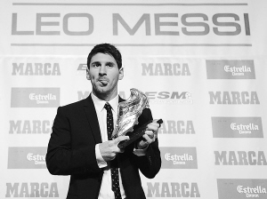 今年25岁的梅西在09-10赛季曾以34个联赛进球首次赢得欧洲金靴奖。上赛季,梅西打入了50粒联赛进球,是上赛季欧洲各大联赛中进球最多的球员,从而再次捧得该奖项,皇家马德里队球星克里斯蒂亚诺·罗纳尔多以46个进球排名次席。