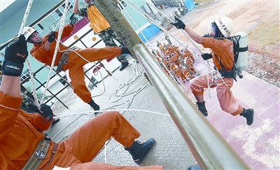 10月30日上午,在省公安消防总队“打造现代化公安消防铁军”为主题的比武竞赛现场,消防官兵们在进行救援技能等比武竞赛。